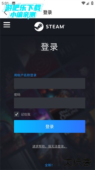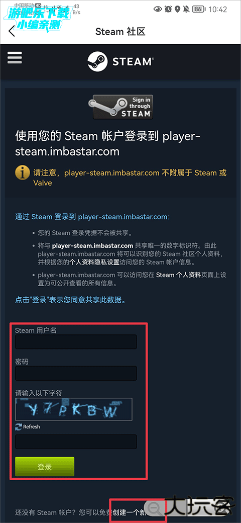 2、在steam社区界面中输入steam用户名、密码、字符后点击登录即可,若用户没有steam帐户可以点击下方创建一个新的帐户,创建完成后在重复上方操作进行登录即可完成绑定