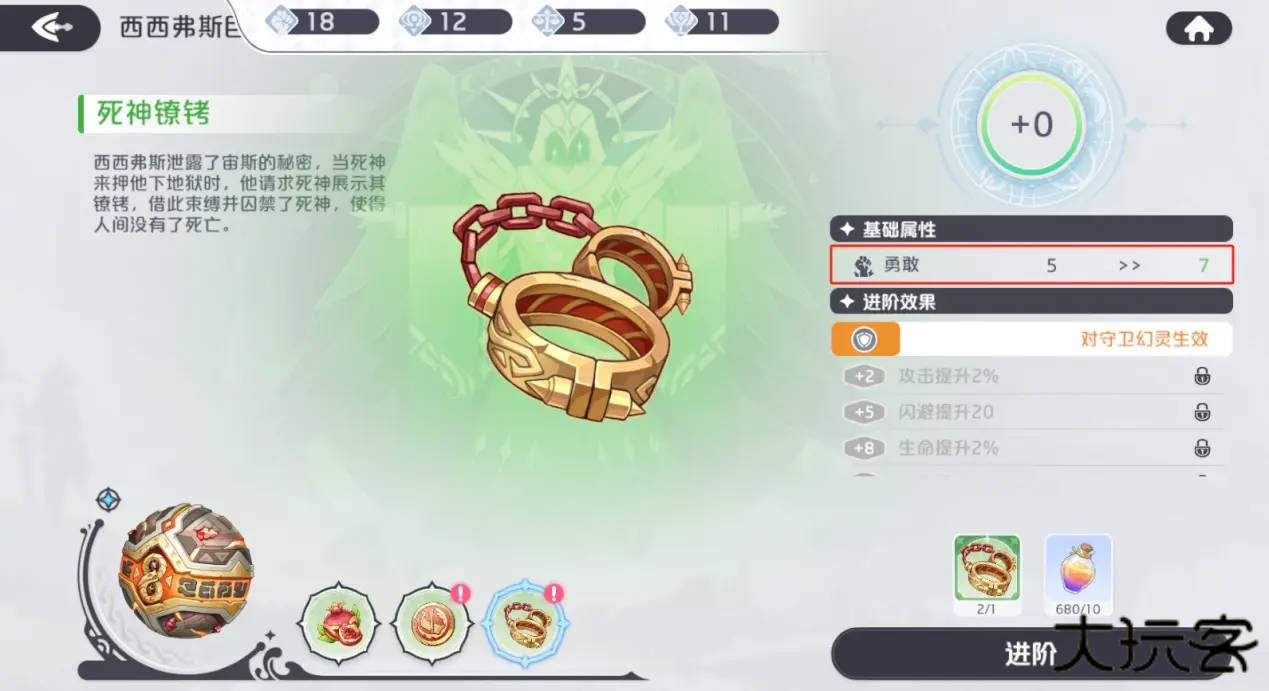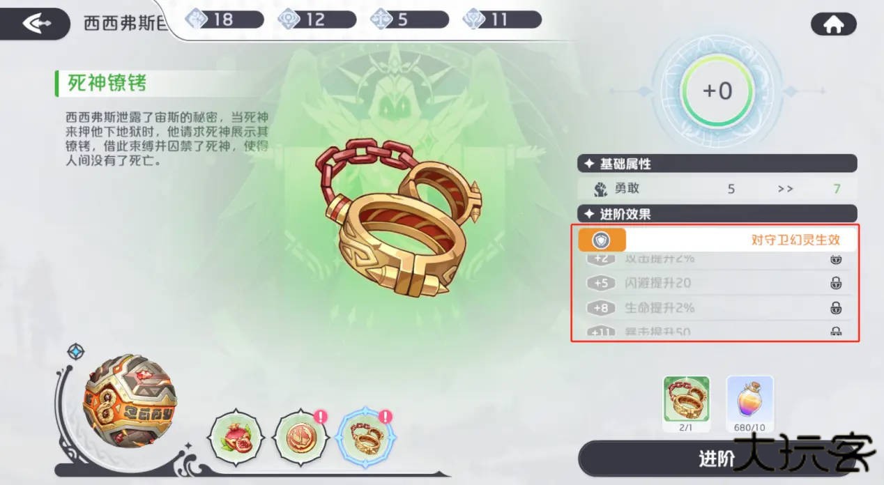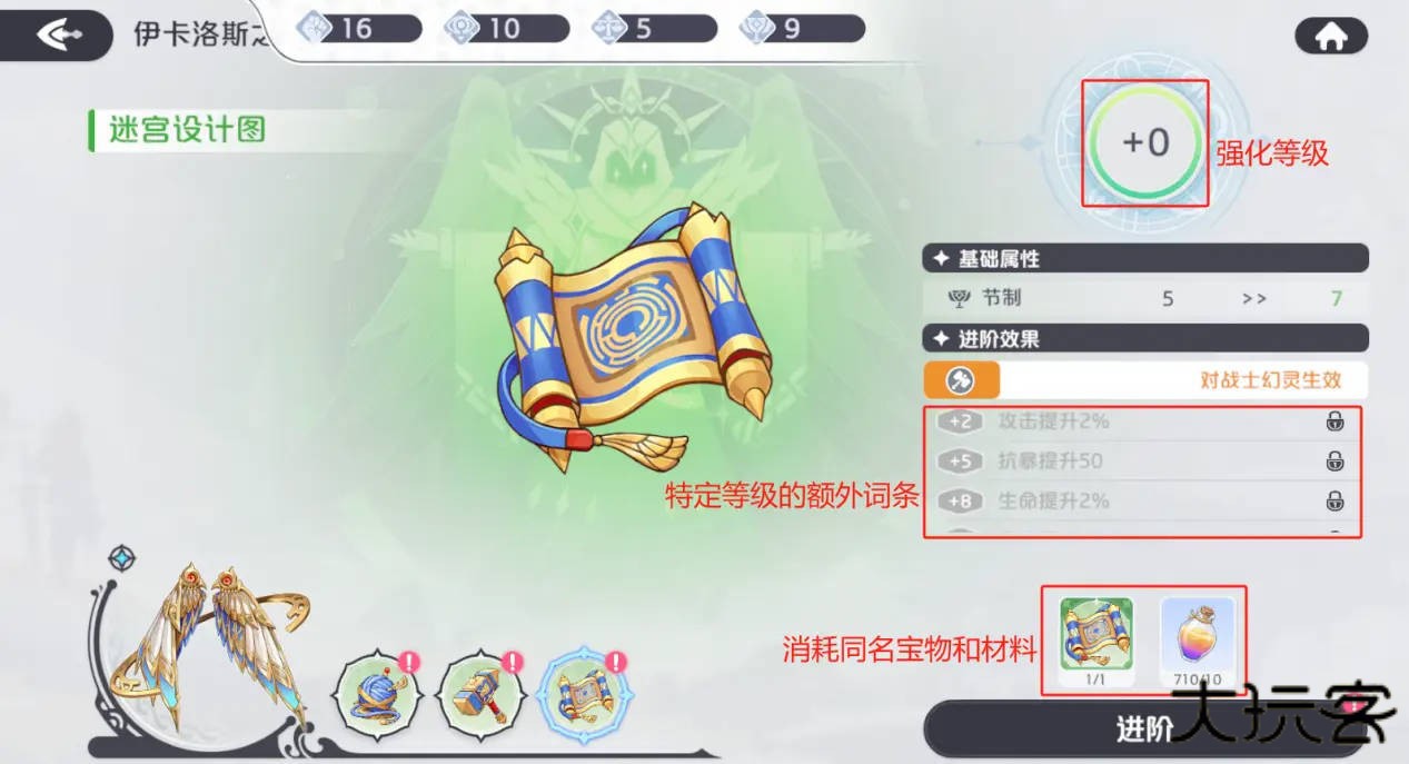 神器升阶同样分为宝物的进阶和神迹的进阶;宝物升阶需要消耗相同宝物和进阶材料,、进阶等级会以+n的形式展示;当神迹关联的整套宝物都进行了一次进阶后,可消耗进阶材料对神迹本体进行一次升阶;升阶可提升宝物与散件带来的数值加成,而宝物和神迹进阶到达一定等级(2+3的倍数级)时,带来的增益效果将会获得额外提升。