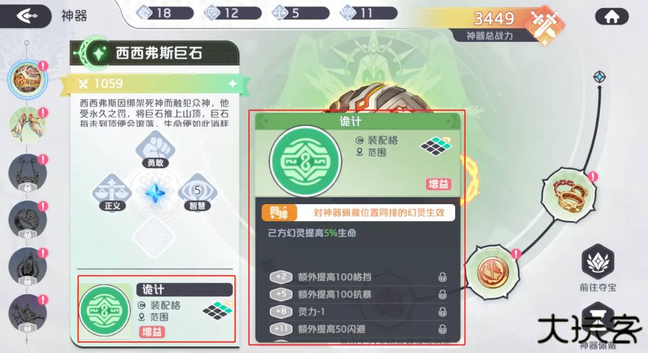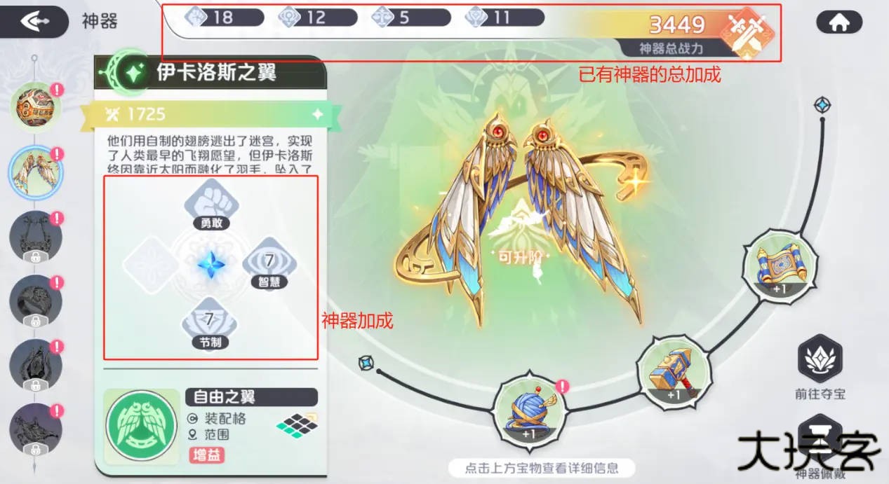 神器能整合套件中所有宝物的主角能力值强化,并直观的提供战力数值加成。且解锁的神器均能同时为主角能力值产生加成,解锁的神器越多,神器带来的总战力加成越强。