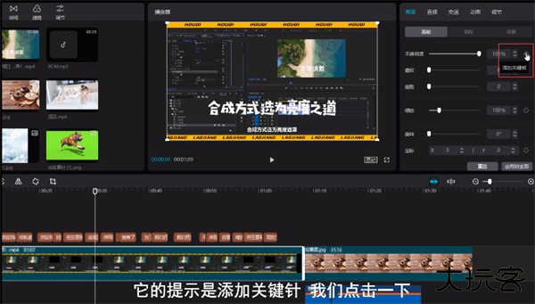 1、选中视频中的某个位置,点击不透明度的菱形,它的提示是添加关键帧,单击一下,在素材上看到一个菱形标志,这个点就是关键帧。