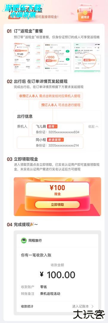 领取返现方法:需要您实名认证后,在同程微信旅行小程序-我的-我的订单-进入具体参与活动的订单--出行信息--乘机人姓名旁边有一个邀请提现--分享给乘机人本人微信号--在微信里面点击链接领取。