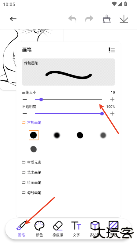 3、之后就可以选择画笔,设置画笔大小、透明度等等;