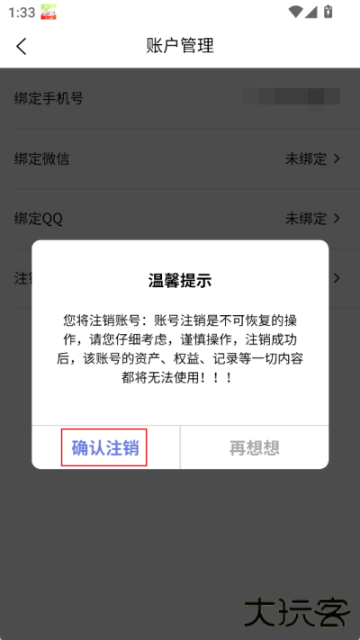 4、点击后会弹出一个温馨提示,用户点击【确认注销】选项即可将账号注销。