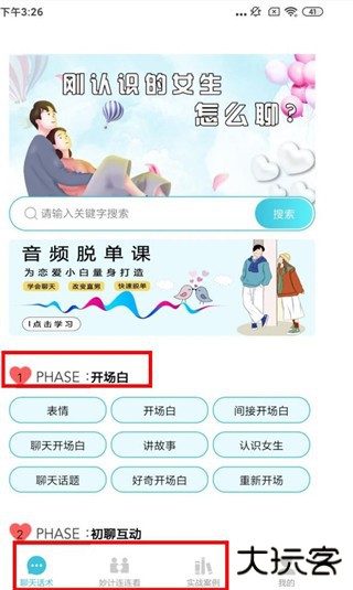 2、进入首页后,即可看到海量开场白、聊天话术、约会技巧、以及实战案例等资源供你选择学习