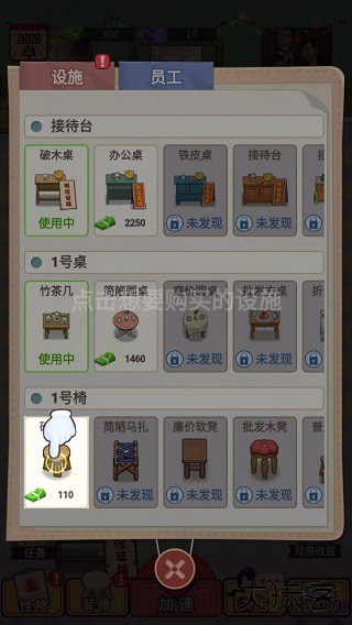 4、只有桌子是不够的,还需要购买椅子让顾客能坐下来慢慢聊。同样的操作方式,点击购买椅子即可。