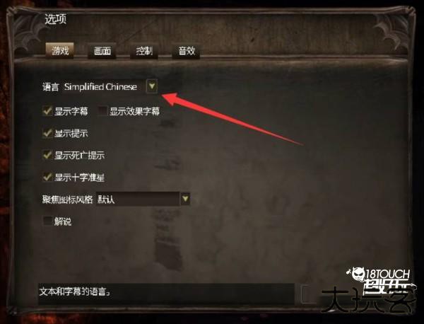 2、在选项中的第一页“游戏”页面中,找到语言,通过下拉菜单选择为simplified chinese(简体中文)即可成功设置。