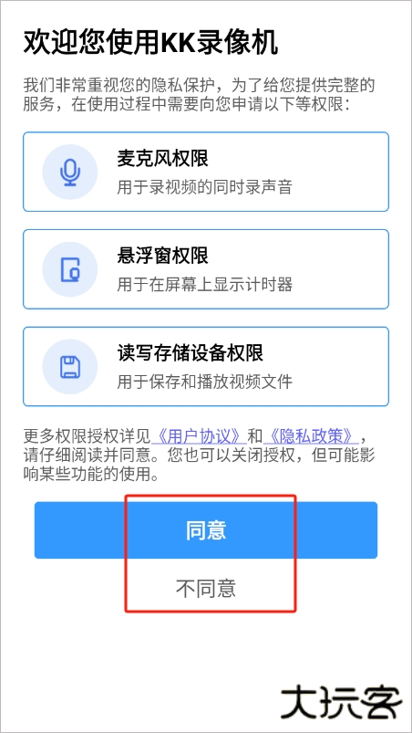 1、进入后我们同意KK录像机app的用户协议;