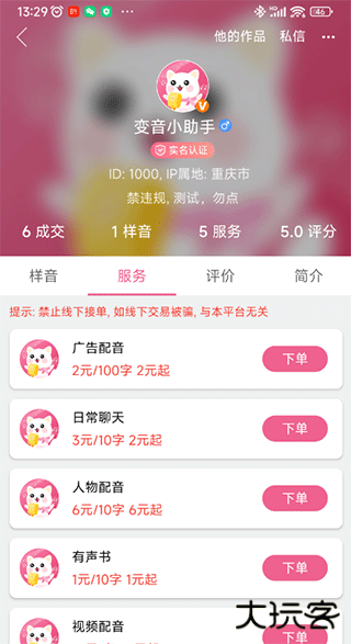 萌配音语音包具备赚钱功能,只需申请成为我们的配乐作者,并通过审核后,即可在个人主页上创建接单功能,自定义金额设置。他人就可以向你下单使用你的专业配乐,这样不仅能享受快乐,也能实现盈利。在享受这份娱乐时光同时,更能收获额外收益。