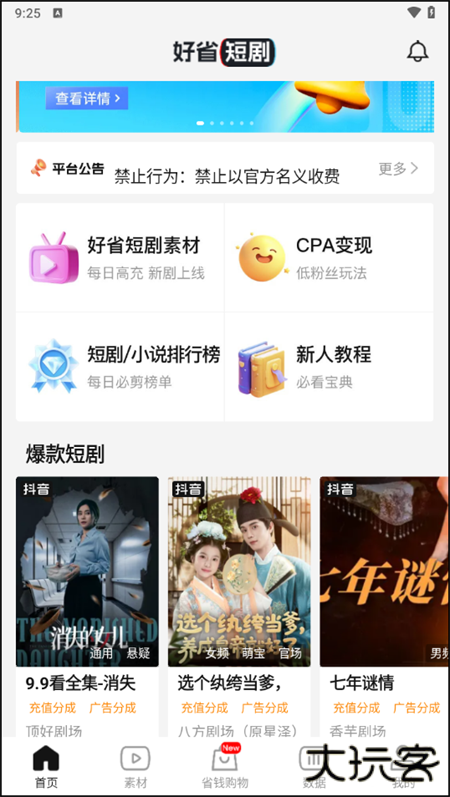 1、在软件首页,我们能够看到好省短剧素材、CPA变现、短剧/小说排行榜、新人教程等一系列板块。