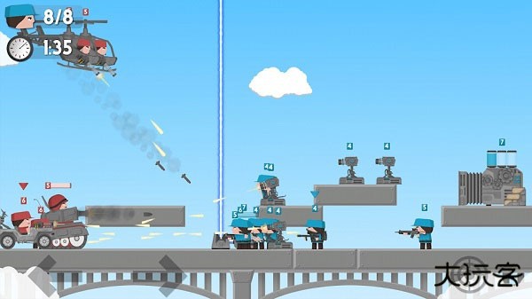 不得不说这游戏的初始兵种设计特别好,但是到后期的坦克兵、直升飞机兵、激光兵显得性价比不高了。好了言归正传。双刃兵血比双兵厚了一点。那么他有什么用处呢?先把他能对付的兵种列一下吧:双兵、步兵、喷火兵、加特林兵、激光兵、坦克兵、散弹兵等等远程兵种。