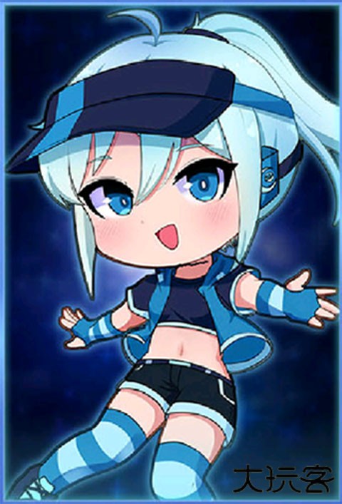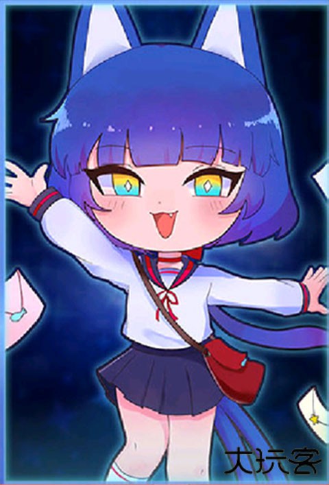 蓝色头发,有一对猫耳,穿着蓝色短袖上衣,黄色短裤,戴着白色手套,在卡牌中是校服,性格比较开朗。