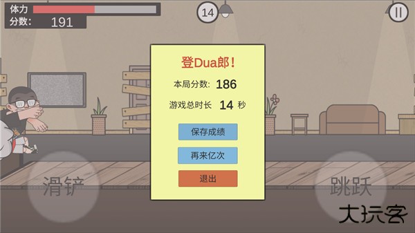 4、点击开始即可开始游戏,左边是滑铲右边是跳跃,玩家需要操控人物躲避杰哥。