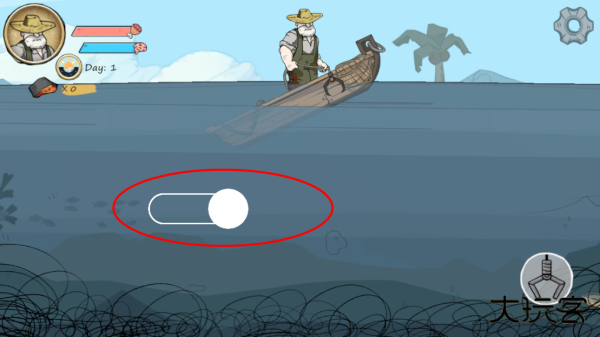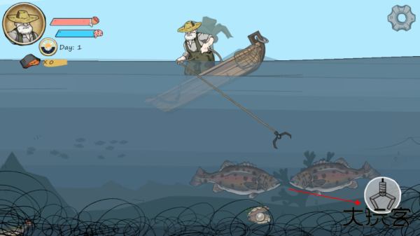3、点击右下角钩子可以抛出鱼钩进行捕鱼,点击屏幕可以掷出鱼叉帮助捕获