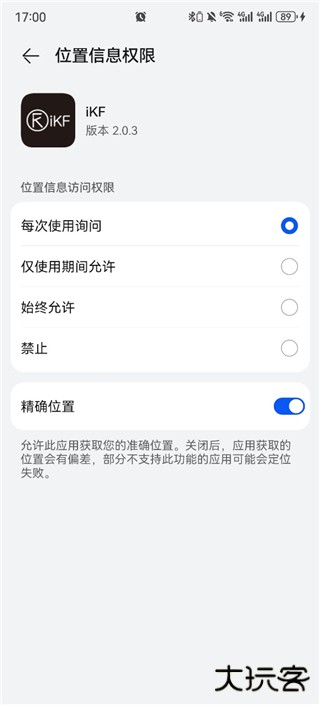 5、补充“位置信息”的权限:打开“设置”-“应用和服务”-“权限管理”-找到iKF-打开“位置信息”-选中“始终允许”。