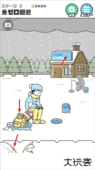 点击远处的广告牌上的鱼竿即可获得,然后点击书包获得鱼饵,接着点击钓竿即可进行钓鱼,成功掉上鱼即可过关。