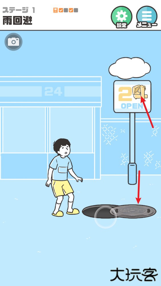 点击广告牌上的雨衣获得,拖动到人物身上即可穿上雨衣,然后跳入井盖中,随后就能够成功躲避雨,然后过关!