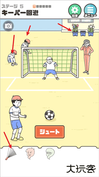 点击远处花坛可以获得一个纸扇,用它击打旁边的两位同学即可获得灵魂,将灵魂放到主角身上即可附身,然后射门就可以进球了,进球后就能过关了。