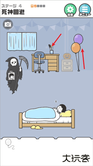 从桌子上拿到马克笔,和旁边的气球,两者组合后会获得一个人脸气球,将气球放到人的身上,死神就会误以为是本人带走,这样就顺利过关了。
