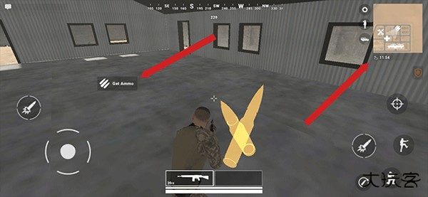 5、刚进入游戏的地方为我方区域,你可以根据地图位置进行弹补给、使用汽车、补血等等,例如补弹,在弹位置后点击get ammo即可补给