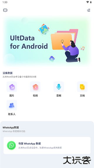 ultdata是一款功能强大的手机数据恢复软件,通过软件用户可以快速找回自己因意外删除的文件、照片、视频等内容,避免了重要文件丢失而造成不必要的麻烦。软件界面设计简约直观,采用了傻瓜式的操作方式,用户只需打开软件即可清楚看到恢复的选项,用户只需在里面筛选自己的需要恢复的内容即可。