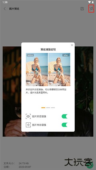 4、如果图片质量太差的话,点击右上角的星星图标,点击开启导出增强;