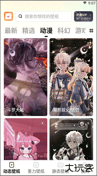 1、下载安装好皮皮动态壁纸,打开软件,选择动态壁纸、重力壁纸或静态壁纸一种来设置。