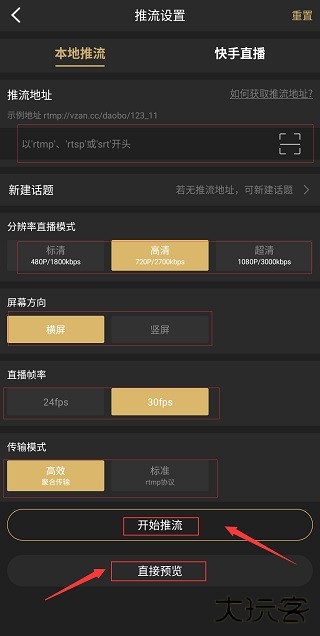 4、设置完成后,点击直接预览或开始推流即可实现直播,将观看地址分享后,观众即可观看直播。