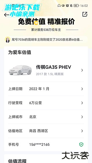 5、填写与车辆有关的信息,点击免费估价,然后点击获取验证码,输入验证码,再次点击免费估价。