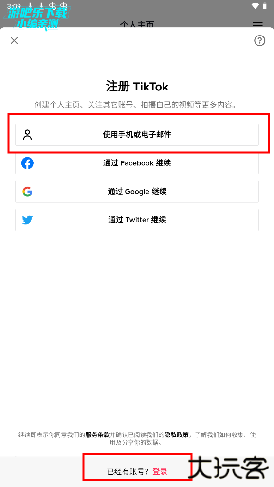 3、选择注册的方式,若已有账号点击下面的登录,输入账号密码即可