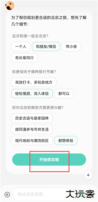 3、在点点进行思考后,会问你旅行的细节,根据自己等情况回答即可,然后点击【开始做攻略】。