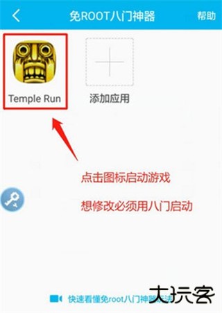 2、添加游戏“神庙逃亡”之后,点击图标启动游戏。记住,一定要在八门内使用修改器启动才能生效;