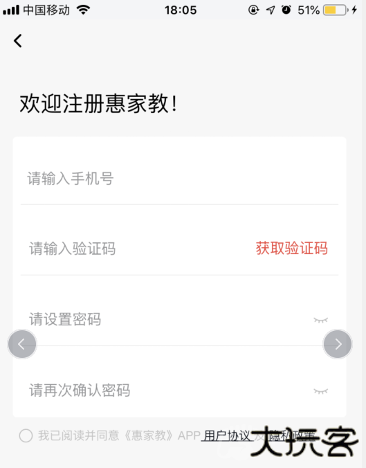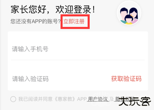 1、打开惠家教APP 进入登录界面,点击右上角【立即注册】按钮进入注册功能。