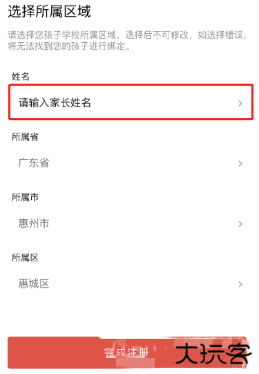 4、点击同意用户协议及隐私政策,点击下一步,进入信息填写页面,正确填写家长个人真实姓名,所属区域信息,点击【完成注册】,即可注册成功。