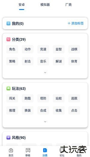 4、点开分类,有按分类、玩法、风格等类型分类的游戏,还有按模拟器、厂商来划分的,玩家可自由选择;