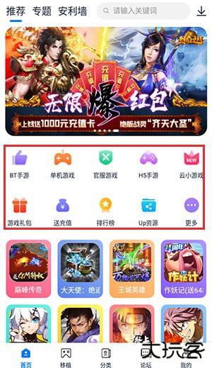 2、在首页,有bt游戏、单机游戏、官服游戏、h5手游等多种游戏类型;