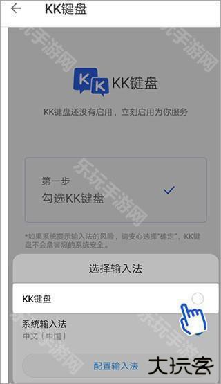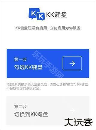 1、在手机上运行软件,选择首页里的“勾选KK键盘”按钮,去打开设置功能里启用KK键盘;