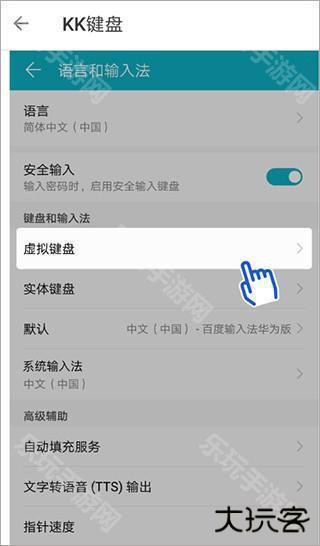 3、除此之外,大家还可以选择去手机的设置页面里找到“语言和输入法”功能,从“虚拟键盘”的功能里设置KK键盘为默认输入。