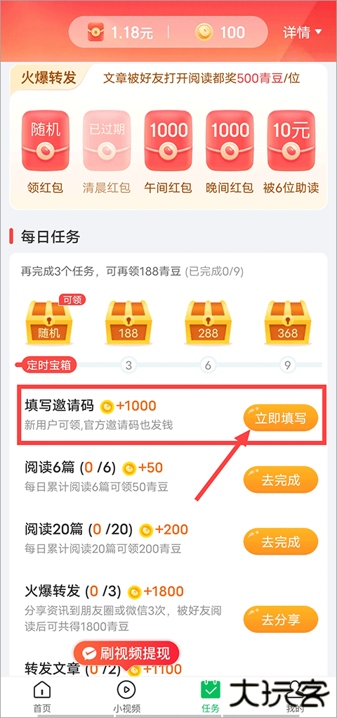 我们只需要完成,新手教程,现金任务,每日任务,分享任务,绑定手机号提现,首次邀请好友还可以领取更多现金。每邀请一人/6元,而做完首次邀请好友的任务之外,之后邀请也能获得很高额度的奖励,而且还有更多的青豆任务可以让我们去完成,任务做的越多青豆赚的越多,赚来的青豆可以直接兑换成现金提现哦!