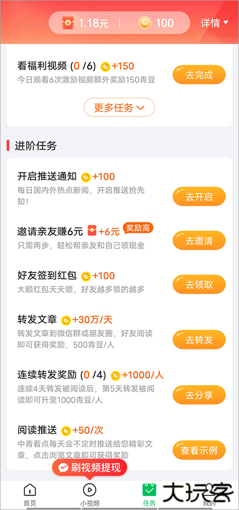 还有超多进阶任务,完成转发文章、好友签到、阅读推送等任务都能获得超多青豆奖励。