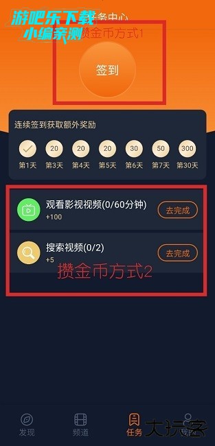 2.可通过签到或是下方的两个任务(观看影视视频/搜索视频)来获取金币,连续签到获取的金币会更多