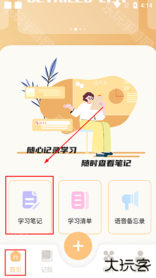1、进入柠檬时光app,在首页内点击【学习笔记】;