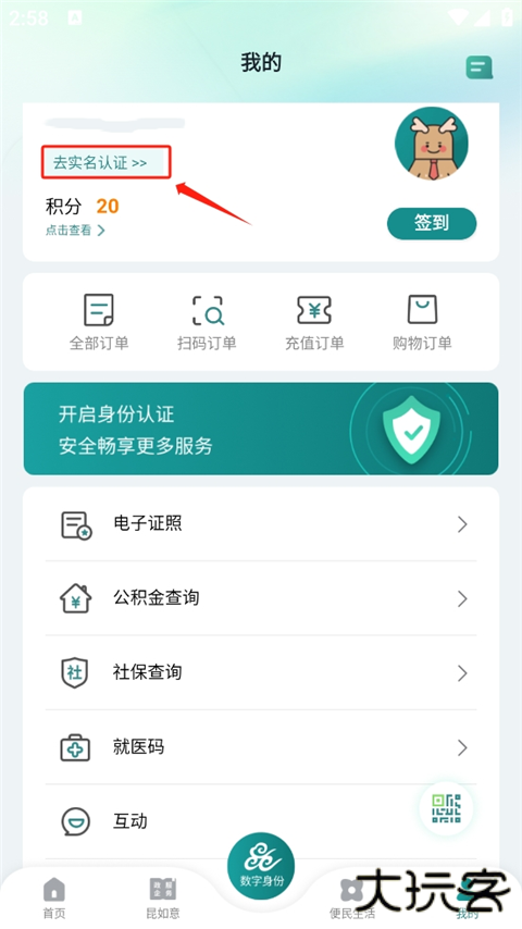 1、用户打开app,进入软件之后选择“我的”页面里的点击“去实名认证”。