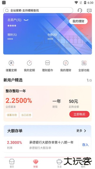 2、在财富模块中,用户可以进行储蓄定期、理财超市、我的理财等操作