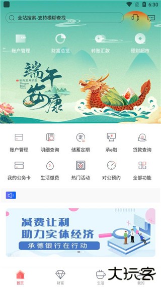 1、进入软件后,用户可以在首页中使用账户管理、财富总览、转账汇款、明细查询等功能