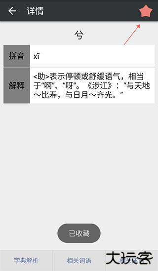 3、点进“兮”还可以看到读音和解释,右上角的星星可以收藏词语到收藏页,方便下次复习。