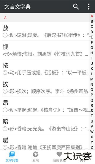 1、在本站下载安装好文言文字典app后,打开进入【文字列表】页面,从索引A开始,往下拉可以看到很多的文言字释义以及出处等详细信息。