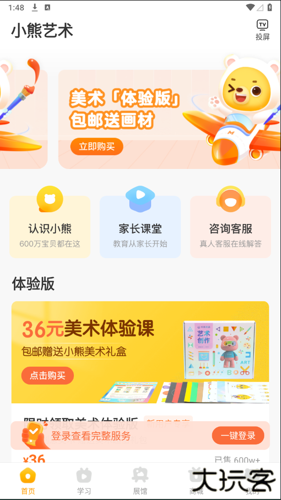 1、首先打开小熊美术课程app,点击【一键登录】,方便更快捷