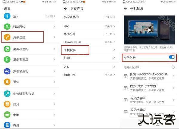 2、 进入设置,点击更多连接,点击手机投屏,打开无线投屏或从手机屏幕顶部向下滑动,呼唤出控制中心界面,点击无线投屏;