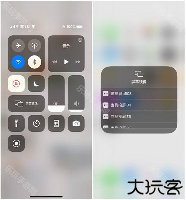 2、进入智能手机的控制中心,打开屏幕镜像或无线投屏功能;