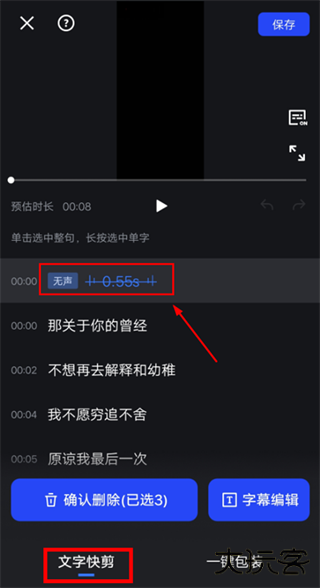 3、【文字快剪】可智能别视频:语气词,无声片段,重复片段;选中即可一键删除,快速提高剪辑效率!